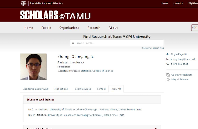 张先扬是美国德克萨斯A&M大学统计系副教授,从事统计的理论和应用的研究工作,所涉及的研究领域包括高维数据分析、多重检验、函数型数据分析、时间序列和经济计量学等。先后在统计学顶级期刊The Annals of Statistics、Journal of the American Statistical Association、Biometrika、Journal of the Royal Statistical Society, Series B以及计量经济学顶级期刊Journal of Econometrics发表论文十余篇。