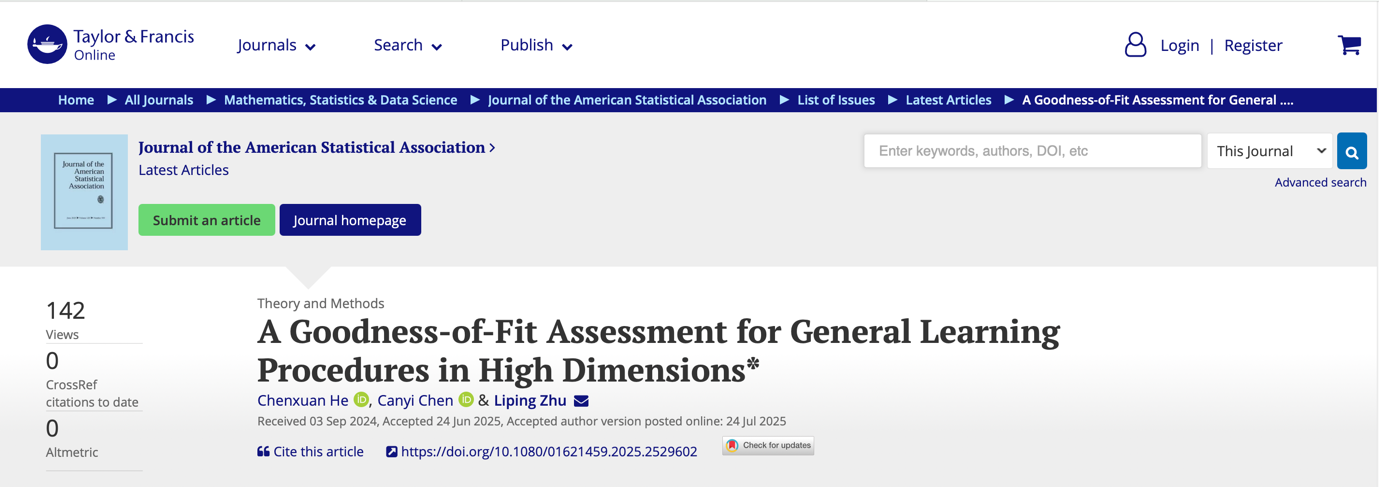 近日,日本a片 博士生何辰轩作为第一作者的论文“A Goodness-of-Fit Assessment for General Learning Procedures in High Dimensions”被统计学顶级期刊Journal of the American Statistical Association接收。