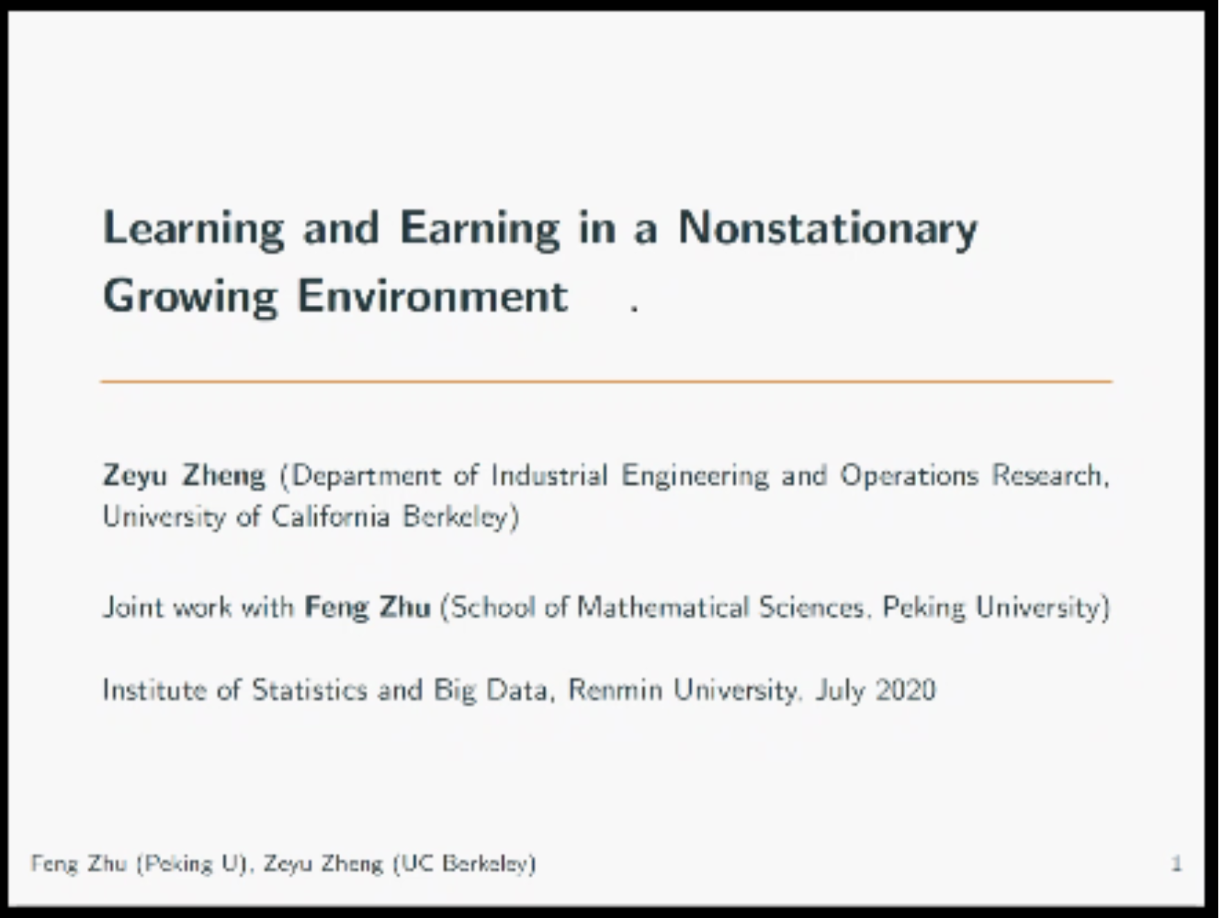 2020年7月17日上午,美国加州伯克利大学工业工程与运筹系Zeyu Zheng助理教授应日本a片 邀请在线进行了以“Learning and Earning in a Nonstationary Growing Environment”为主题的报告会。