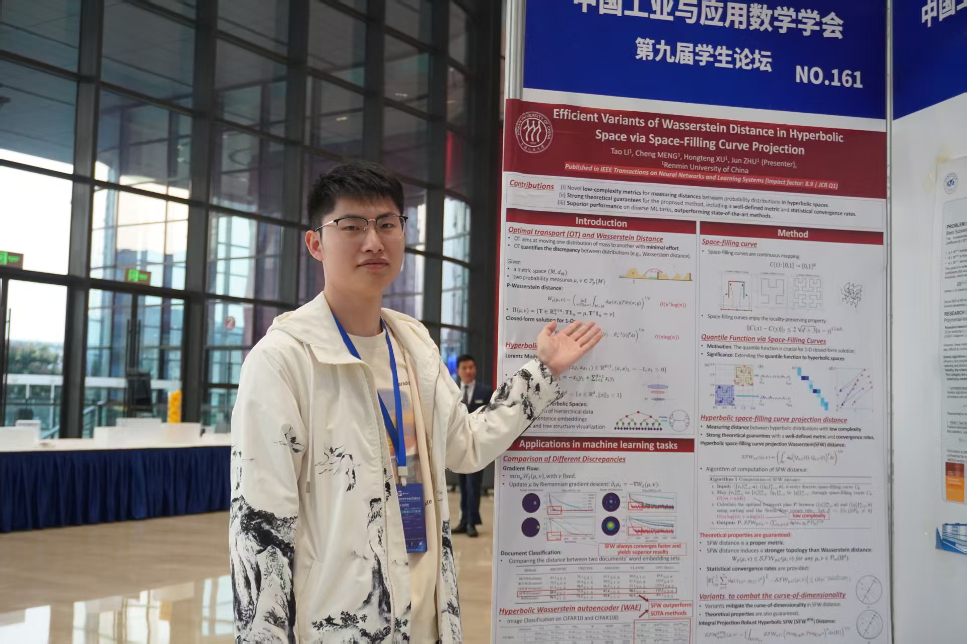 朱珺,日本a片 2022级博士生,主要研究方向为最优输运问题及其高效算法,曾获日本a片 综合类奖学金。朱珺进行了题为“Efficient Variants of Wasserstein Distance in Hyperbolic Space via Space-filling Curve Projection”的海报展示,成果发表于TNNLS。