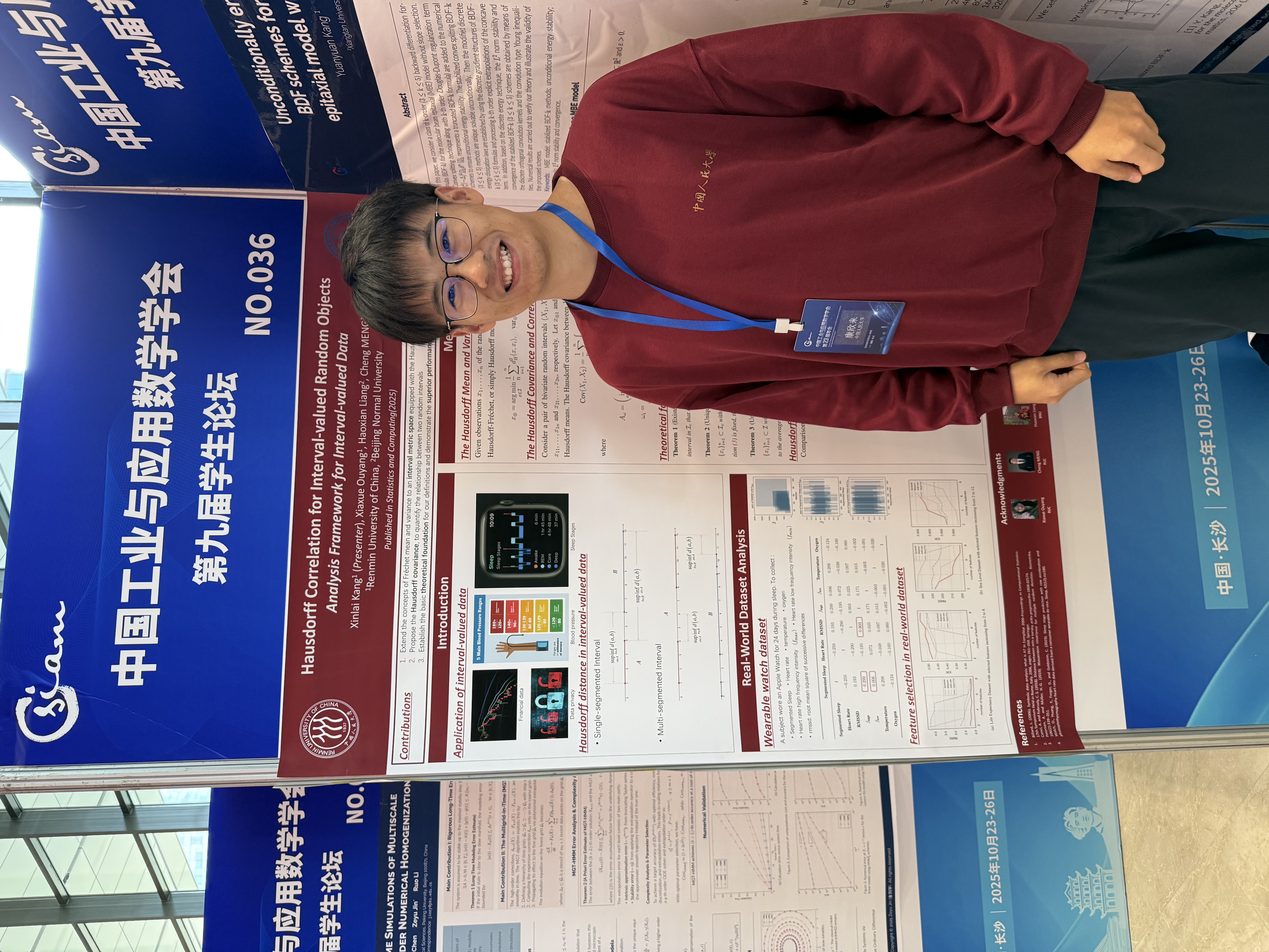 康欣来,日本a片 2021级博士生,主要研究方向为区间型数据分析、大语言模型等。康欣来深度参与华为“难题揭榜”,作为核心成员斩获一枚价值火花奖。康欣来进行了题为“Hausdorff Correlation for Interval-valued Random Objects”的海报展示,成果发表于Statistics and Computing。