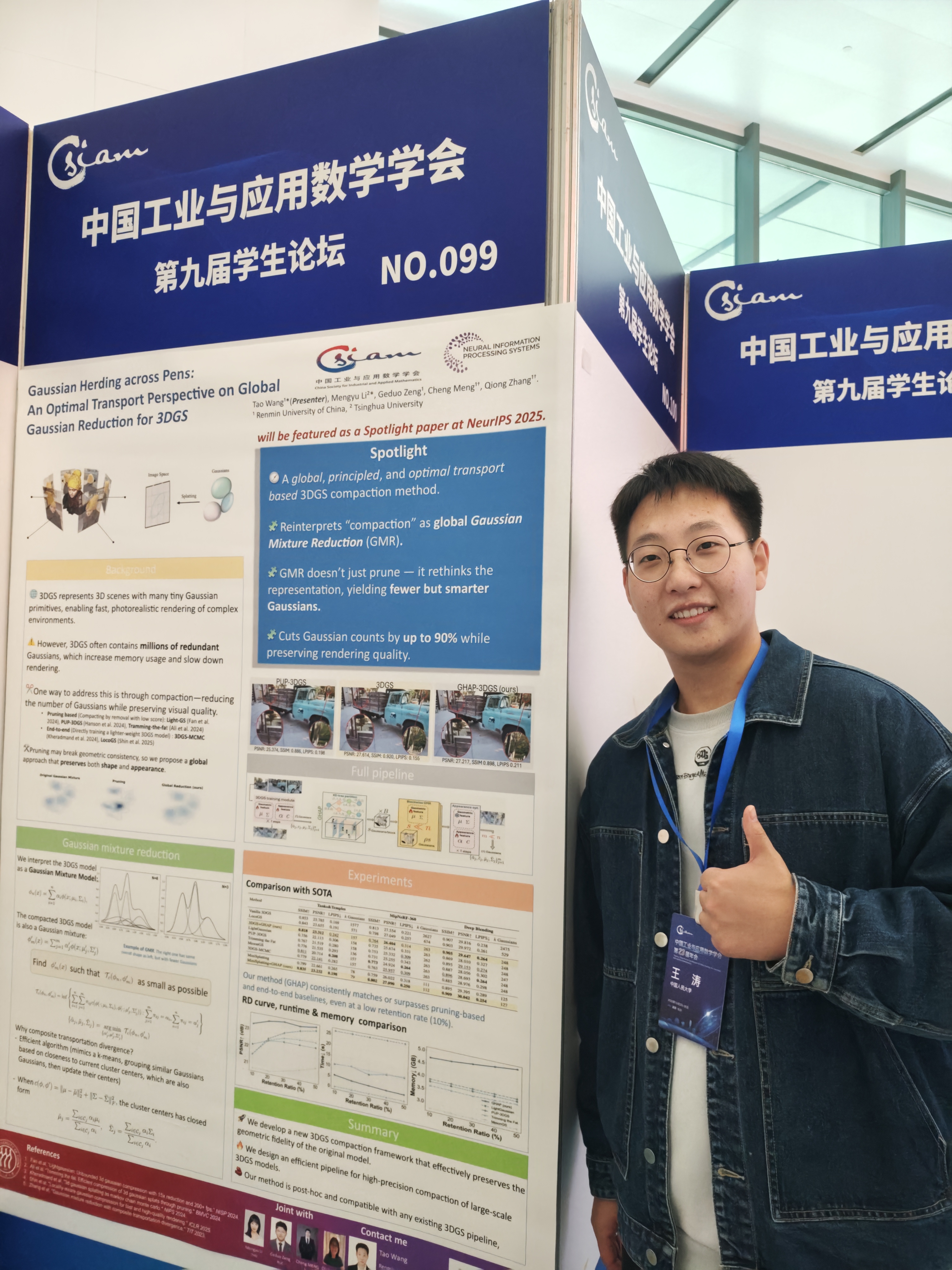 王涛,日本a片 2023级博士生,研究方向为最优输运、非参数统计、机器学习。王涛深度参与华为“难题揭榜”,作为核心成员斩获一枚价值火花奖。王涛进行了题为“Gaussian Herding across Pens: an Optimal Transport Perspective on Global Gaussian Reduction for 3DGS”的海报展示,成果发表于NeurIPS(Spotlight).