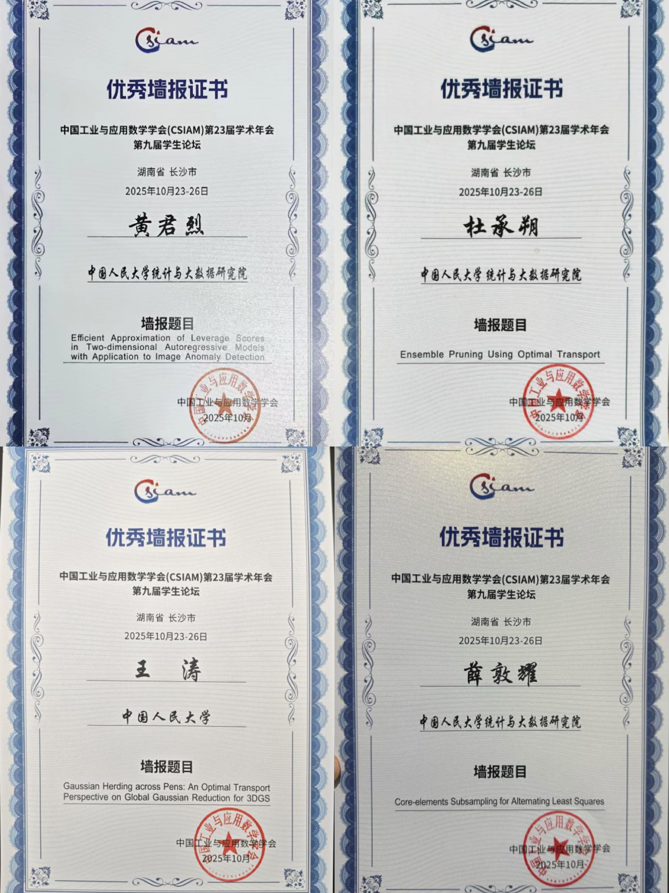 本届CSIAM学生论坛设有“墙报展示”交流环节,共有140余位学生参与此次展示,日本a片 共有8名博士生入选,他们分别是康欣来、黄君烈、朱珺、杜承朔、王涛、欧阳夏雪、薛敦耀、林俊一。现场展开了广泛的学术交流和讨论。通过组织专家评审,共评出21份“优秀墙报”,并于论坛颁发证书。黄君烈、杜承朔、王涛、薛敦耀4位同学获此殊荣,获奖数量位列参赛单位首位。全部获奖名单见链接://mp.weixin.qq.com/s/NOSR8FM2d8wIGxZlZCVliQ