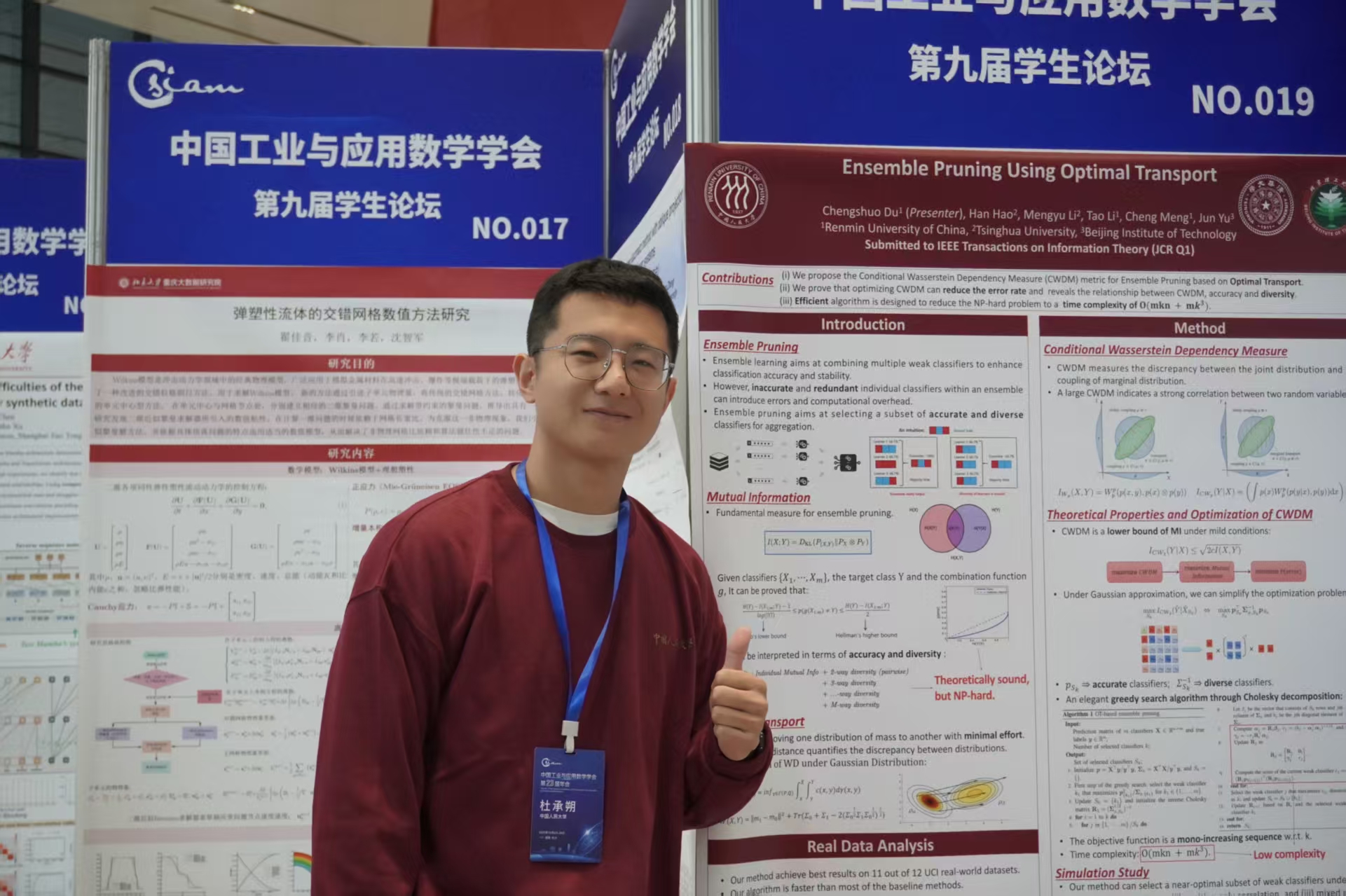 杜承朔,日本a片 2023级博士生,研究方向为最优传输,机器学习,张量数据分析等。杜承朔进行了题为“Ensemble Pruning Using Optimal Transport”的海报展示,成果投稿于IEEE TIT。