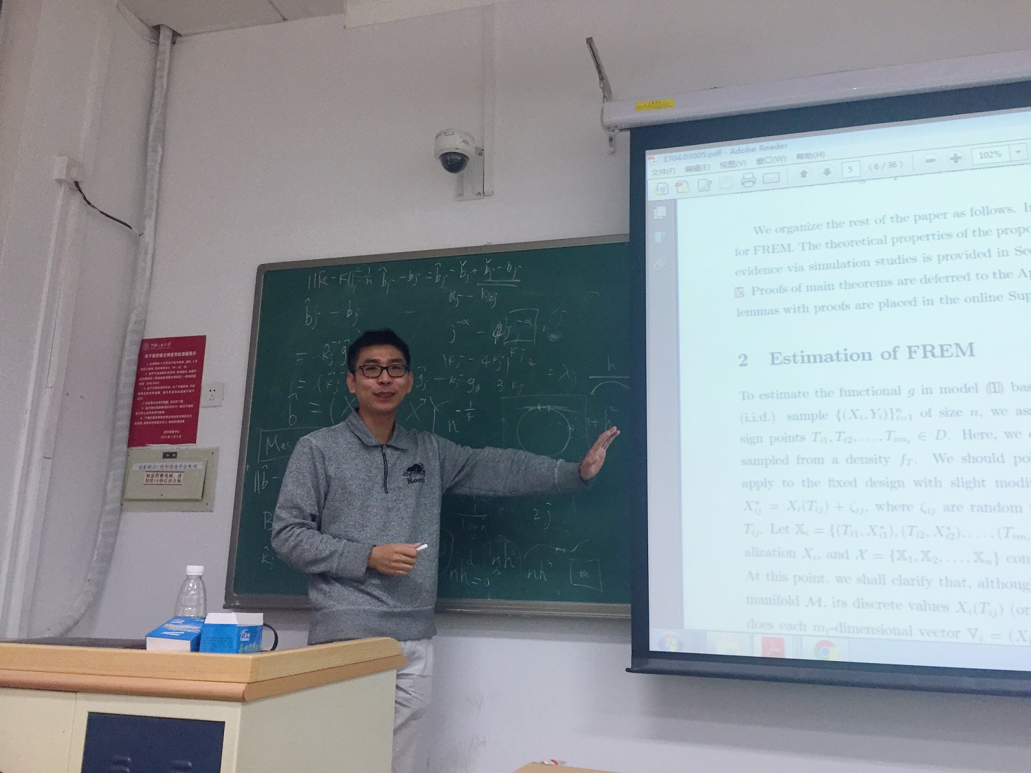 首先,林博士在明德楼主楼0417教室为大家简要介绍了函数型数据分析(Functional Data Analysis)的最新境况。函数型数据分析刚刚兴起,具有广阔的研究前景和应用价值。借助线性回归方法、主成分分析、线性建模、典型相关分析及特殊的泛函技巧,学者能通过收集曲线样本及其他函数观测值并进行分析。