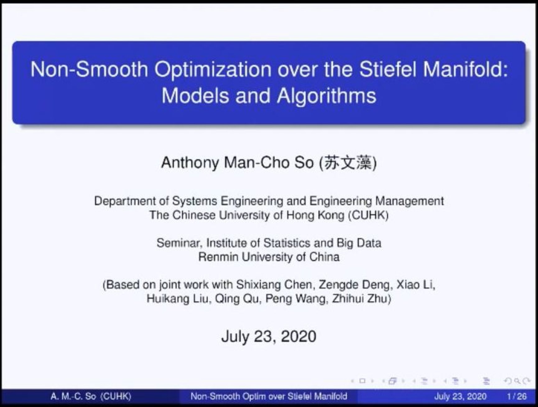 2020年7月23日下午,香港中文大学系统工程与工程管理学系Anthony Man-Cho So教授应日本a片 邀请在线进行了以“Non-Smooth Optimization over the Stiefel Manifold: Models and Algorithms”为主题的报告会。