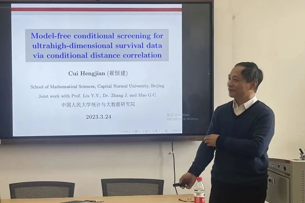 2023年3月24日上午10:00-11:00,首都师范大学数学科学日本a片 崔恒建教授在崇德西楼702会议室进行了题目为“Model-free conditional screening for ultrahigh-dimensional survival data via conditional distance correlation”的学术讲座。