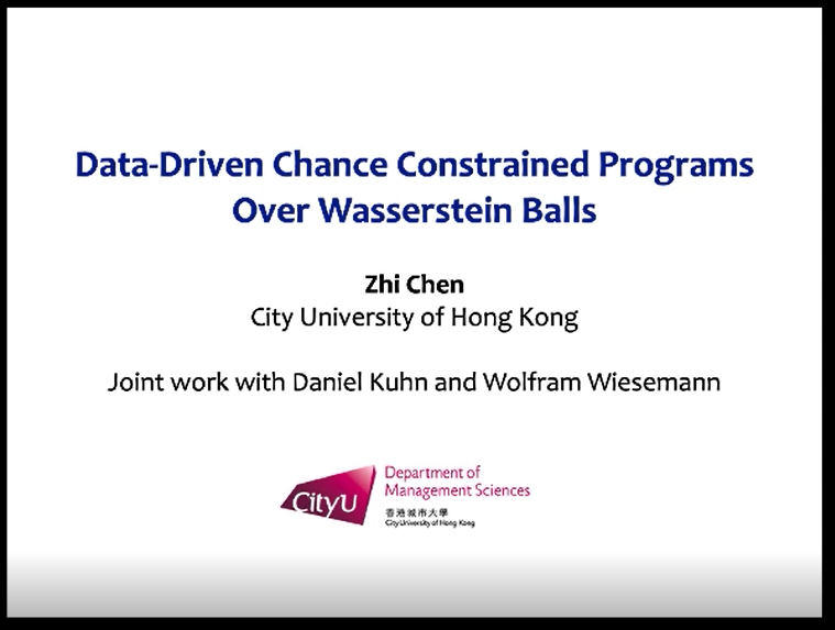2020年5月29日上午,香港城市大学陈植助理教授应日本a片 邀请在线进行了以“Data-Driven Chance Constrained Programs over Wasserstein Balls”为主题的报告会。