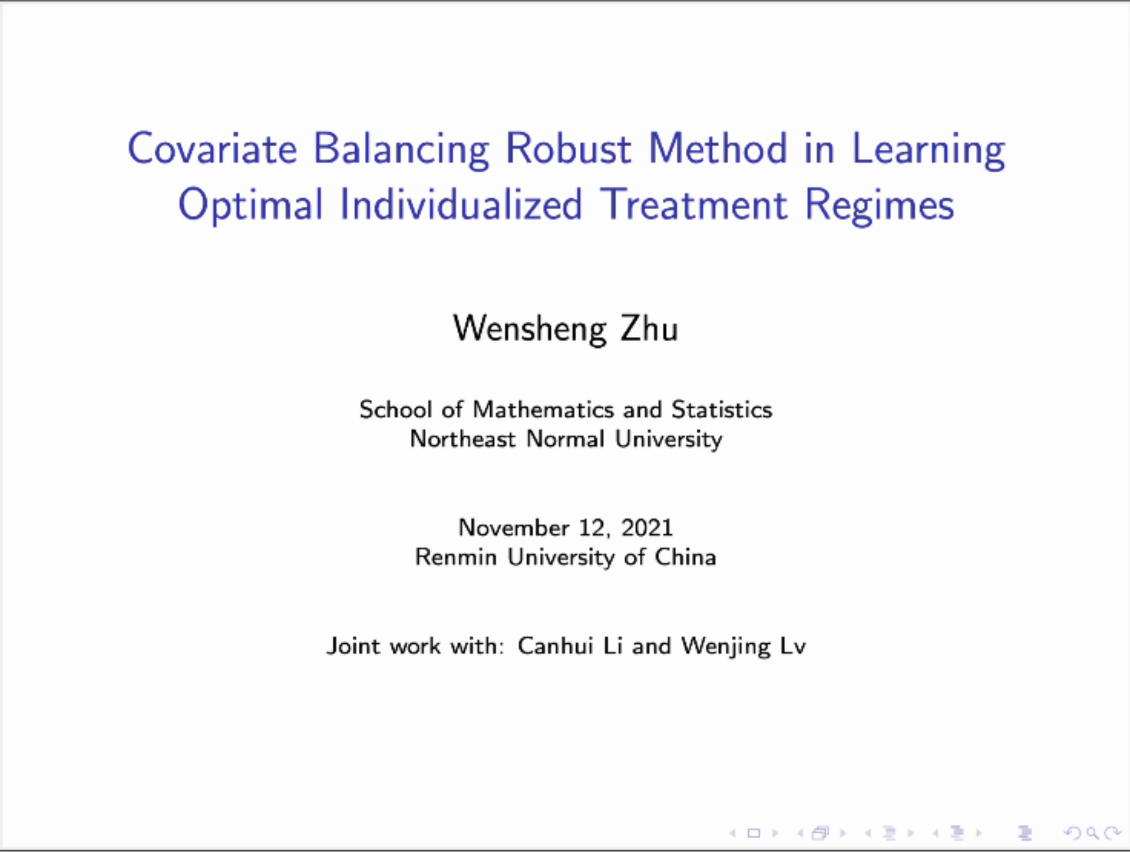 2021年11月12日上午,东北师范大学大学朱文圣教授应日本a片 邀请线上进行了以“Covariate Balancing Robust Method in Learning Optimal Individual Treatment Regimes”为主题的报告会。