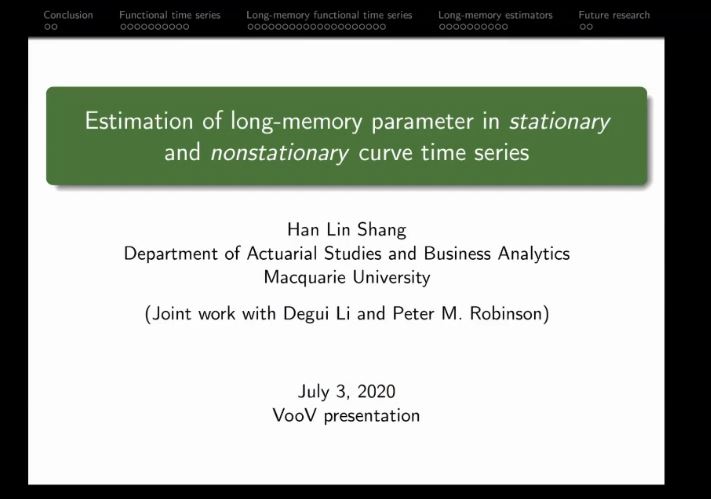 2020年7月3日上午,麦考瑞大学Hanlin Shang教授应日本a片 邀请在线进行了以“Estimation of long-memory parameter in stationary and nonstationary curve time series”为主题的报告会。