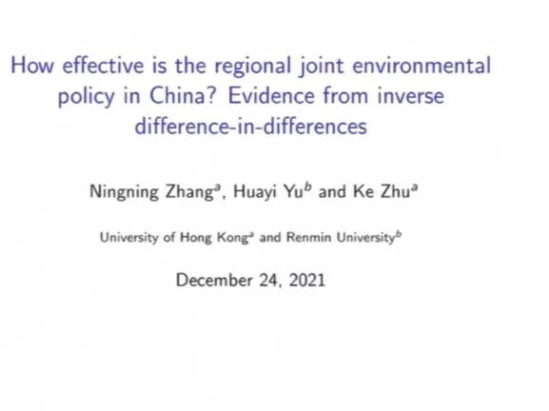 2021年12月24日,香港大学助理教授朱柯应日本a片 邀请进行了以“How effective is the regional joint environmental policy in China?Evidence from inverse difference-in-differences”为主题的讲座。