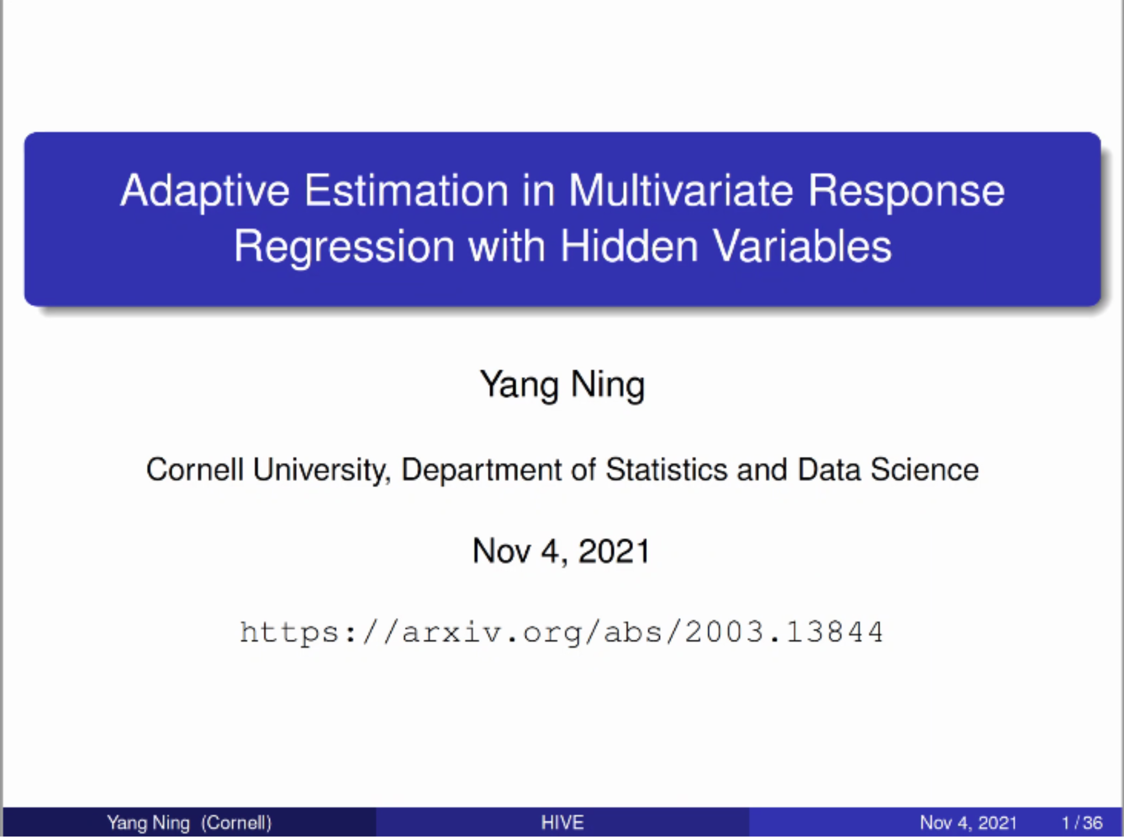 2021年11月5日上午,康奈尔大学Yang Ning助理教授应日本a片 邀请在线进行了以 “Adaptive Estimation in Multivariate Response Regression with Hidden Vrriables”为主题的报告会。