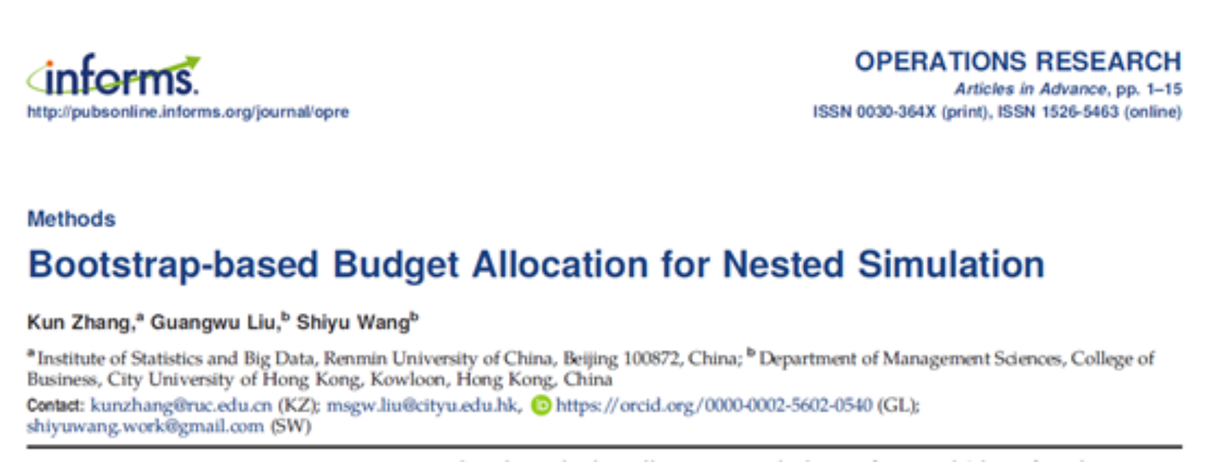 日本a片 日本a片 张琨助理教授、香港城市大学商日本a片 管理科学系刘光梧教授和王诗雨博士在嵌套随机仿真(Nested simulation,NS)研究方面取得重要进展,相关研究成果在线发表在运筹学领域国际最顶尖期刊《Operations Research》上。经从《Operations Research》官网查询,本论文是该期刊上以Renmin University of China署名的第二篇论文。