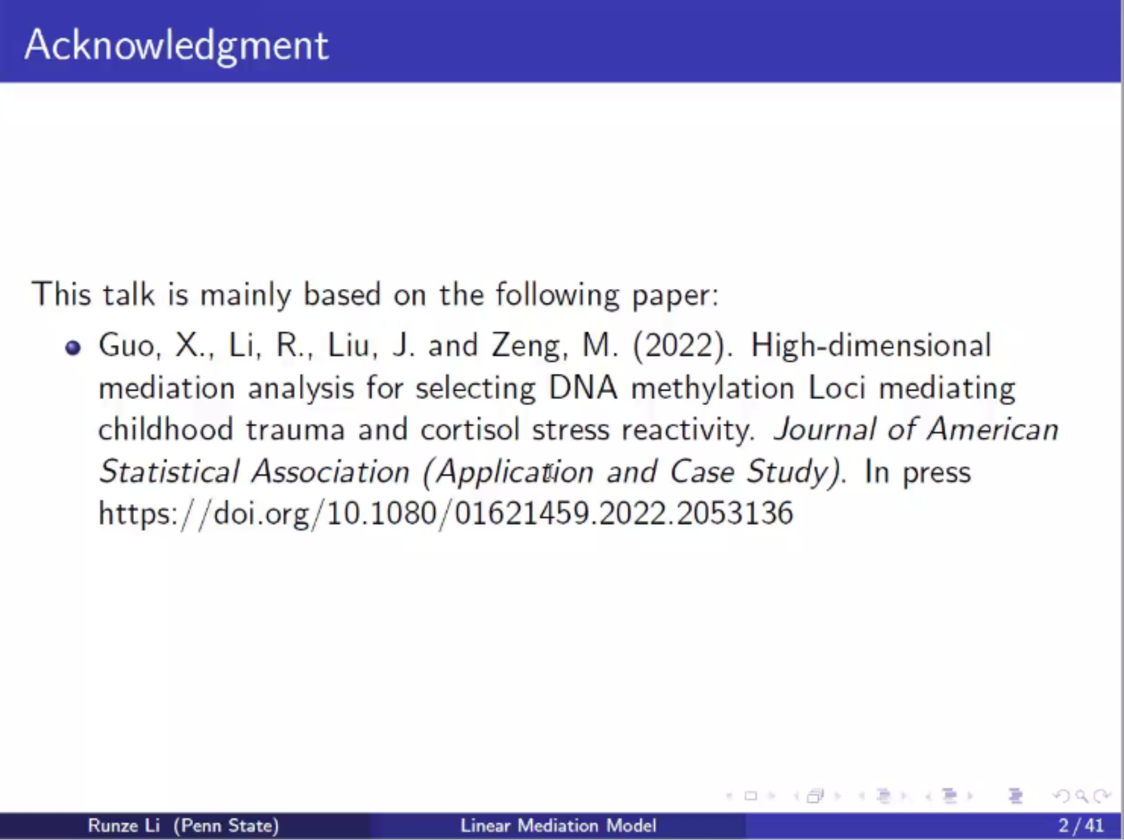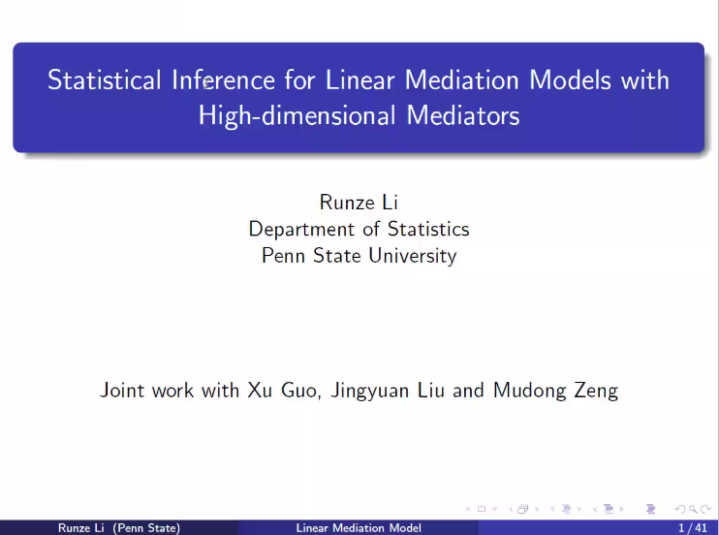 2022年5月13日,宾夕法尼亚州立大学帕克分校李润泽教授应日本a片 邀请进行了以“Statistical Inference for Linear Mediation Models with High-dimensional Mediators”为主题的讲座。