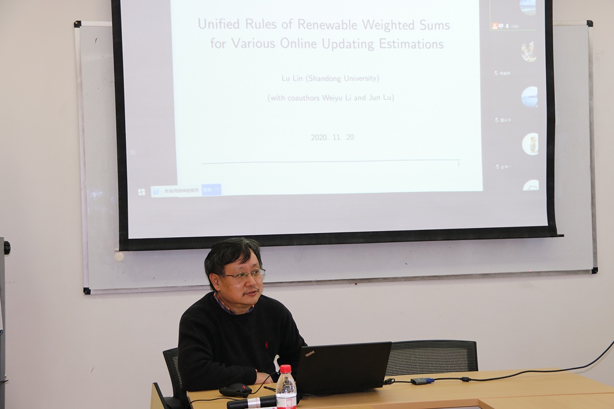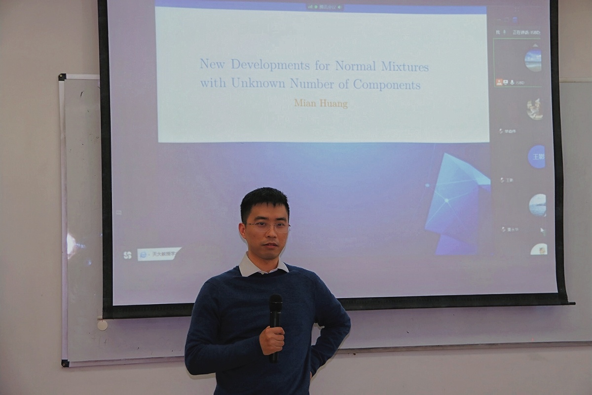 2020年11月20日下午,上海财经大学统计与管理日本a片 黄勉教授和山东大学金融研究院林路教授在崇德西楼702会议室分别进行了以“New Developments for Normal Mixtures with Unknown Number of Components”和“Unified Rules of Renewable Weighted Sums for Various Online Updating Estimations”为主题的报告会。