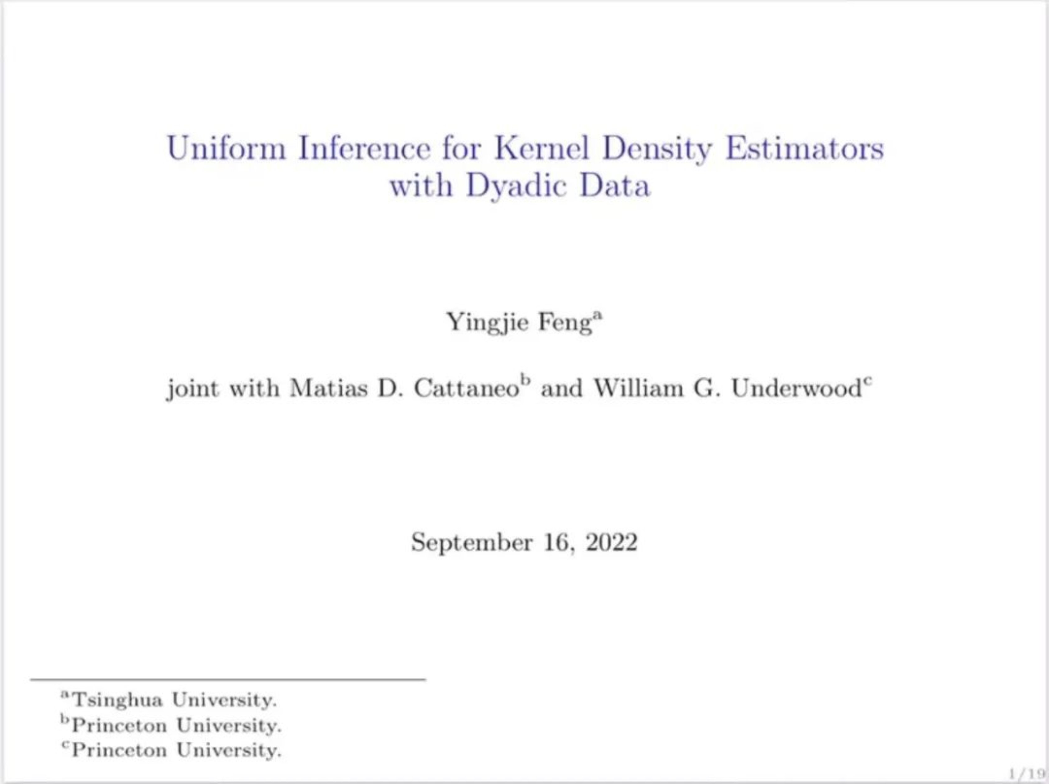 2022年9月16日,清华大学冯颖杰助理教授应日本a片 邀请进行了以“Uniform Inference for Kernel Density Estimators with Dyadic Data”为主题的讲座。