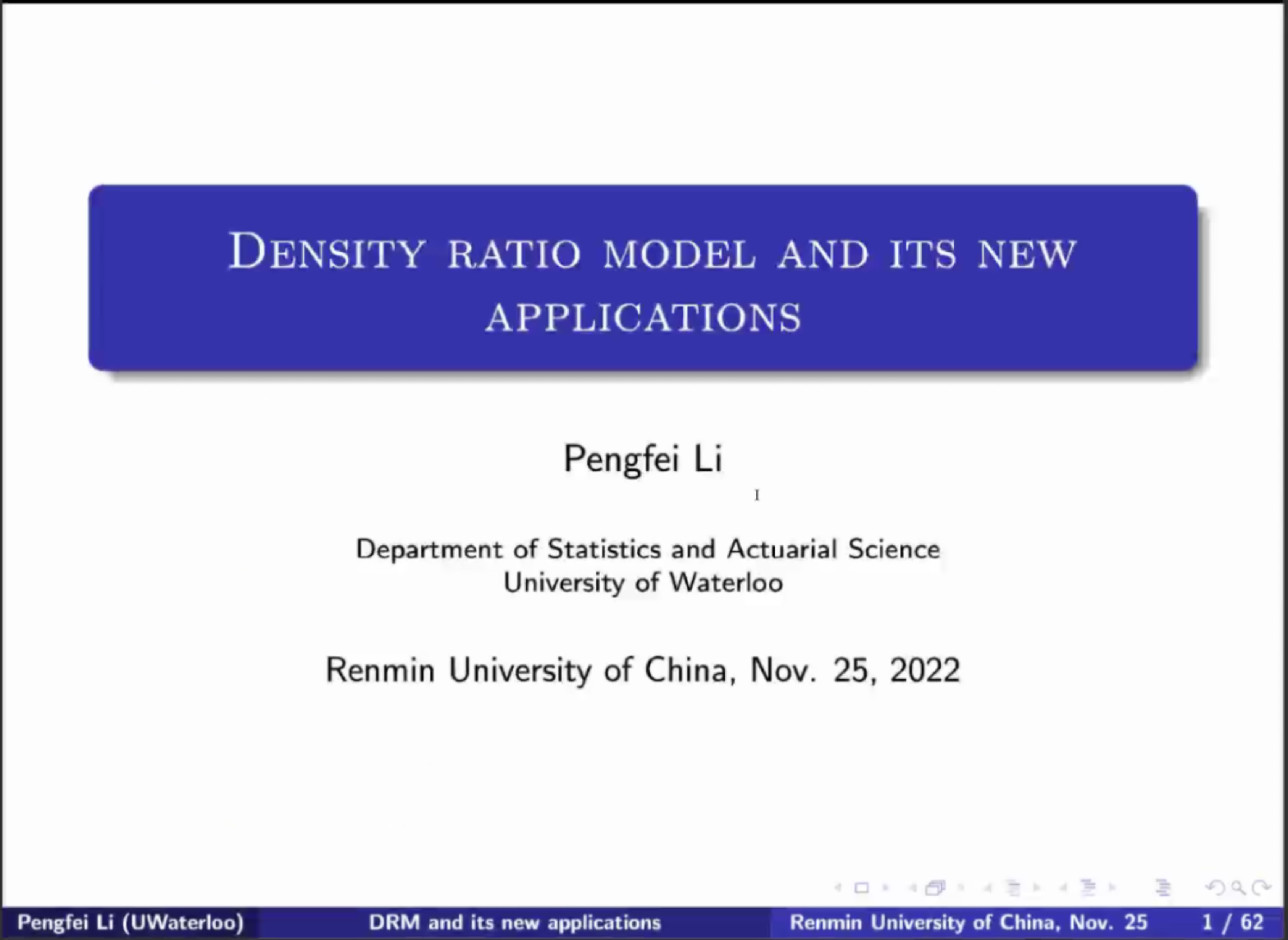 2022年11月25日上午10:30,滑铁卢大学教授Pengfei Li应日本a片 邀请进行了以“Density ratio model and its new applicaitons”为主题的线上讲座。