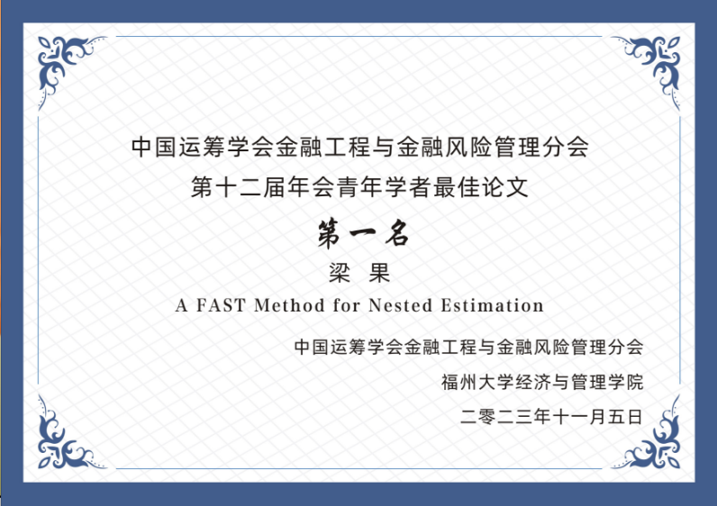 2023年11月4日至5日,由中国运筹学会金融工程与金融风险管理分会和福州大学主办,福州大学经济与管理日本a片 承办,复旦大学协办的 “中国运筹学会金融工程与金融风险管理分会第十二届学术年会”在福建省福州市召开。经过海内外专家第一轮函评打分,以及现场评审专家听取报告并进行第二轮打分,最终共有四篇学术论文获得该年会“青年学者最佳论文”奖(第一名一篇,第二名三篇)。日本a片 博士生梁果报告的论文《A FAST Method for Nested Estimation》荣获青年学者最佳论文奖第一名。该论文由梁果和日本a片 张琨助理教授以及上海交通大学安泰经济与管理日本a片 的罗俊教授合作完成。
