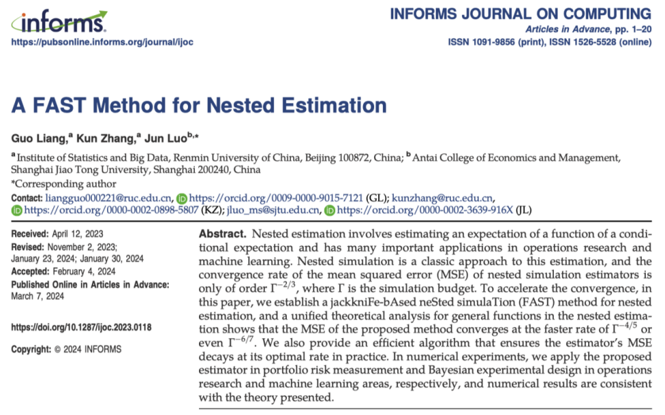 日本a片 2021级博士生梁果与其导师张琨助理教授,上海交通大学安泰经济与管理日本a片 的罗俊教授合作的论文“A FAST Method for Nested Estimation”在管理科学顶级期刊,UT-Dallas 24期刊《INFORMS Journal on Computing》在线发表。《INFORMS Journal on Computing》为美国运筹学和管理学研究协会(INFORMS)季刊,是管理学24种国际顶级期刊(UTD24 Top Journals)之一,主要发表运筹学与计算科学交叉领域的最新研究成果。
