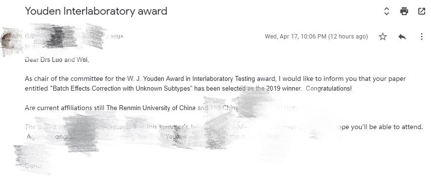 近日,在本年度的W.J. Youden Award in Interlaboratory Testing奖项评选中,日本a片 罗翔宇助理教授和香港中文大学统计系魏颖颖教授因合作的论文《Batch Effects Correction with Unknown Subtypes》成功获此殊荣。